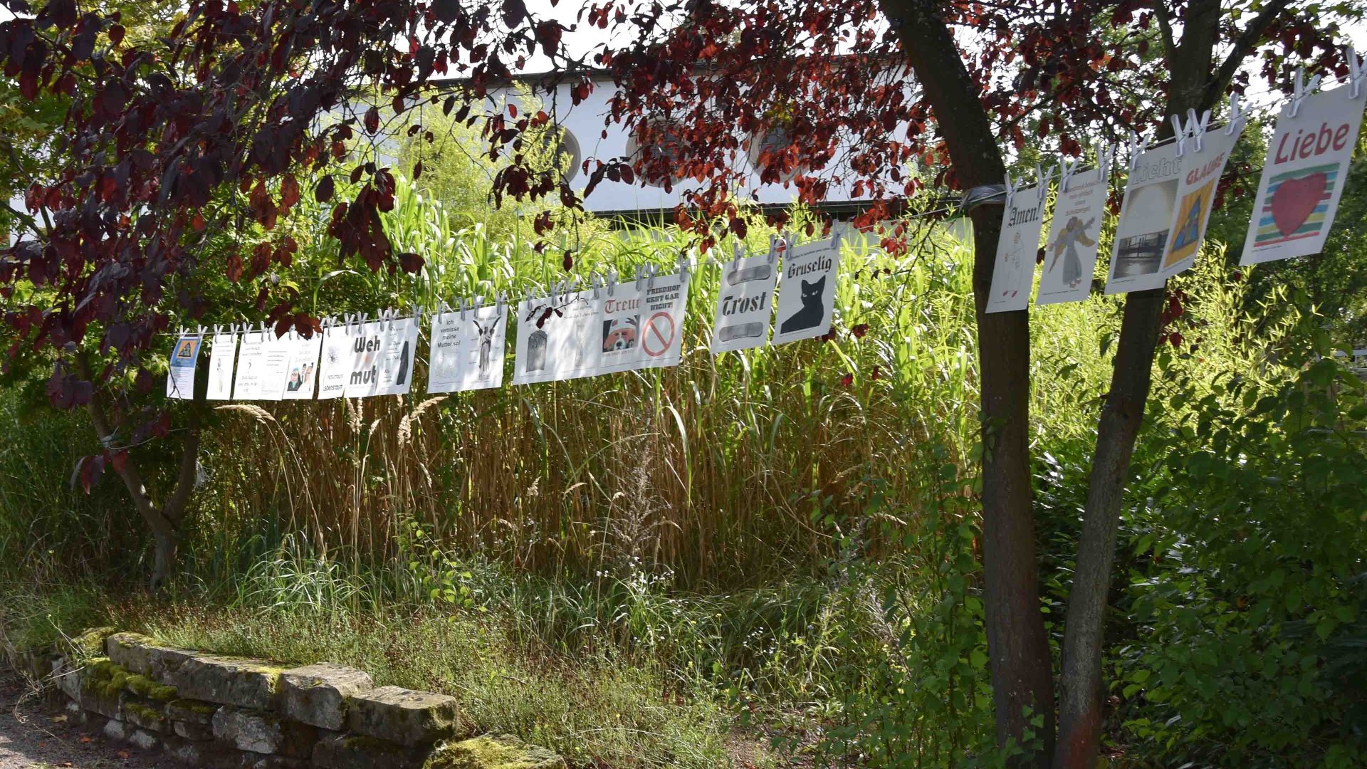 Bei einem Rundgang durch die Installation sehen die Besucher*innen die Verarbeitung von Trauer in Form von Gedichten und Bildern. So auch Auszüge von Gedichten von Sandra Trunk, die ihre eigene Trauer und Verzweiflung nach dem Tod eines nahestehenden Menschen verarbeitet. Die Besucher*innen begegneten gleichzeitig aber auch Begriffe wie Vertrauen, Treue, Trost, Schutzengel, Freundschaft, Licht oder Erinnerung, die heilsam auf uns im Hier und Jetzt wirken können.