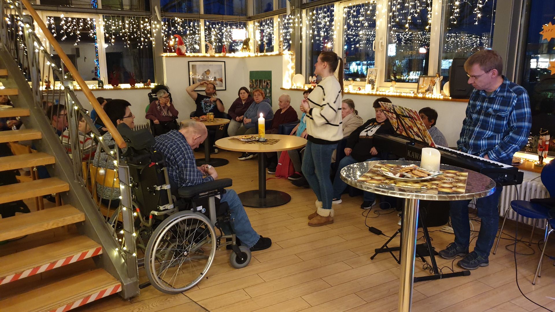 Wir freuen uns alle, dass wir nach drei Jahren, in denen die Geschenke nur abgegeben werden durften, uns nun wieder in diesem Rahmen persönlich sehen.“ Mit diesen Worten begrüßte die Leiterin des Wohnhauses Schifferstadt, Marion Funk, Pfarrer Stefan Mühl und Stefanie Pruschina von der Pfarrei Hl. Edit Stein, Schifferstadt. Denn wieder hatten die Frauen der KFD unter der Leitung von Frau Pruschina im Advent in der Pfarrei Wunschzettel angeboten. Und wie vor 30 Jahren, als der damalige Pfarrgemeinderat St. Jakobus die „Wunschzettelaktion“ zu Weihnachten begann, hatten zahlreiche Mitchristen diese genommen, um die von ihnen gekauften Geschenke dann im Pfarrbüro abzugeben. Nun war der Tag der Geschenkübergabe gekommen, die Anspannung unter den zu beschenkenden Menschen mit Behinderung war spürbar. Eingeleitet mit dem Lied „Stille Nacht, heilige Nacht“, bei dem alle innig mitsangen, begleitet von Ansgar Müller-Wissmann an der elektrischen Orgel, entwickelte sich von Anfang an eine wohltuende, frohmachende Atmosphäre, die Pfarrer Stefan Mühl mit einer mutmachenden Weihnachtsgeschichte vertiefte. Mit einer Erzählung, was noch an der Krippe zu Bethlehem geschah, und die verdeutlichte, dass es nicht auf die Größe eines Geschenkes ankommt, und was es gekostet hat, sondern auf das, was wir von Herzen schenken.